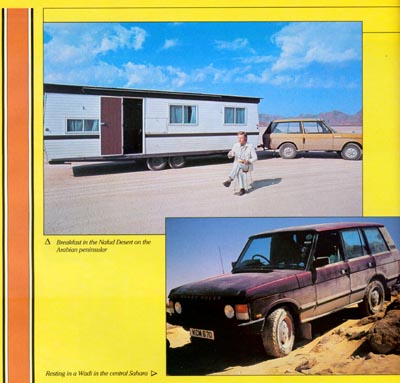 The Range Rover continued through Syria, Jordan, and across the spectacular scenery of the Nafud desert where parts of the road were obscured by sand dunes. The driving was very difficult due to the terrain and the weight of the enormous caravan, but again the dependable Range Rover design performed impeccably.