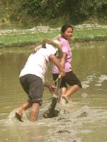 The sight and sound of the workers in these watery fields has probably changed little in the last 1,000 years and here we felt transported in time to a prehistoric era. Reality returned when we descended the hillsides again and drove the riverside trail. The road builders hew out swathes of broken hillside and cut a rough road which clings precariously to the valley wall, 20m to 30m above the river bed. There are no embankments here and no safety rails, and cars and trucks regularly slip down the escarpment and into the river. In most cases the wreck is beyond economic recovery and the vehicle will be stripped bare and carted away in pieces.
