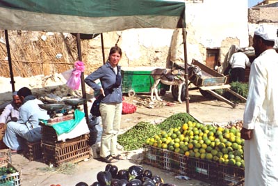 Laura buying oranges at the fruit Market in Siwa