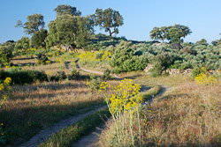 We lunched under some trees in a small hollow filled with flowers and surrounded by broom. We ate ham-dressed croissants, a tin of pilchards, green salad with cucumber, tomato and onion, lashings of mayonnaise and a glass of Portuguese wine. The afternoon continued with more tracks more views and ever more wildflowers, and we returned to camp around teatime. What a great, gratifying and rewarding day this has been.