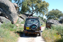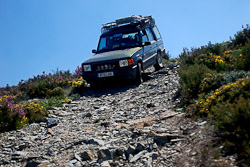 We hit the ridge that divides Spain and Portugal and drove along the border with a wheel in each country. We encountered some very difficult ascents on loose shale peppered with football sized rocks. Some of these slopes were at least 30%, some steeper still. Raymond’s navigating skill are superb, he can find these lost, abandoned routes.