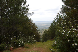 Gaining height, the bush and scrub gave way to forestry where our track was easier to navigate. We reached a junction which was not marked on the map, but by reading our altitude and following the contour lines on the map, Raymond was able to positively identify our track, route and heading. We continued ascending to 1,260m (4,133 ft) and passed a watch tower high on a ridge. We paused to admire the sweeping view of this wild countryside.