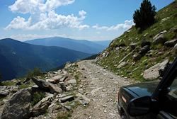 We arrived at Fos on the border of Spain and set off up a verdant valley. At the end of a slow 20 mile drive up a track, increasing snow damage told of springtime avalanches. Finally a great 50 yard snowdrift lay in our way. It had slithered down the mountain, sweeping many trees in its wake and was clearly impenetrable. We were forced to make a multi point turnaround on the mountainside and retrace our steps.