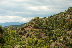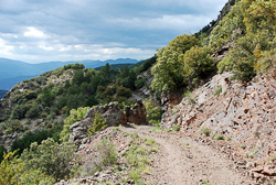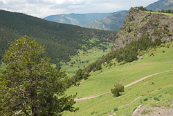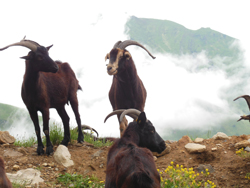Eventually we reached a partly abandoned hamlet called Tor. Here the road ended and the climb began. The track was fair but steep and rocky. As we climbed higher and higher, the forest thinned giving way to upland pastures. We were now at 5,000ft. A large drove of mares nursed their newly born foals. At 6,000ft we were on open rocky terrain with isolated trees dotted around.